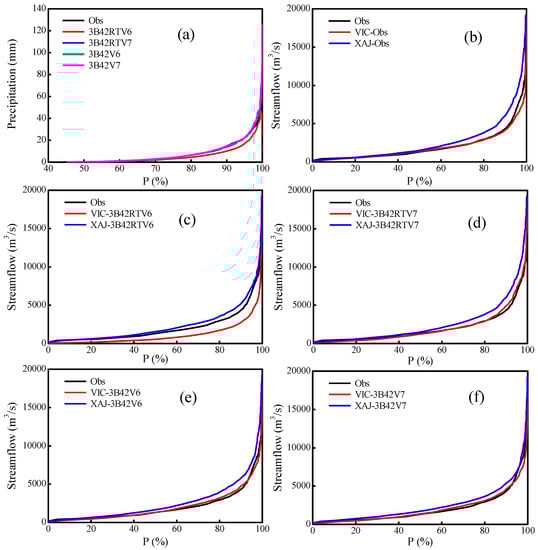 Cumulative probabilities of precipitation and streamflow in the Ganjiang River basin were shown in Figure 10. The results showed that the cumulative probabilities of precipitation in the Ganjiang River basin for the 3B42RTV7, 3B42V6, and 3B42V7 products were higher than that of observed precipitation, while the cumulative probability of precipitation for the 3B42RTV6 was lower than that of the observed precipitation. It indicated that the cumulative probabilities of streamflow simulation driven by TMPA products were higher than that of the observed precipitation in the Ganjiang River basin by using the XAJ hydrological model. Generally, the cumulative probabilities of streamflow by the VIC hydrological model driven by the observed precipitation, 3B42RTV7, 3B42V6 and 3B42V7 were similar to that of the observed streamflow in the Ganjiang River basin. Meanwhile, the cumulative probability of precipitation by the VIC hydrological model driven by 3B42RTV6 was much lower than that of observation. Moreover, the differences between the observed and simulated probability distributions were significant by using the Kolmogorov–Smirnov statistic method (p < 0.05).