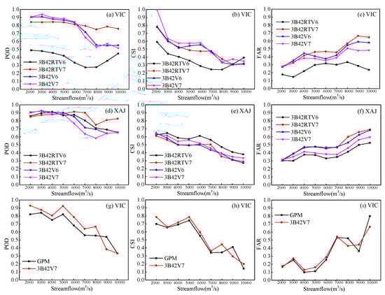 The statistical indices (POD, CSI, and FAR) for different streamflow thresholds of the VIC and XAJ models were shown in Figure 11. High values of POD and CSI at streamflow from 2000–6000 m3/s indicated that VIC model driven by TRMM precipitation products performed better (Figure 11a,b). However, there was a poor performance for the 3B42RTV6 precipitation in the streamflow simulation by using the VIC model. The POD and CSI values decreased obviously while the FAR increased as the streamflow getting bigger and bigger, which indicated the limited capability of VIC model driven by 3B42RTV7, 3B42V6 and 3B42v7 for detecting large streamflow (Figure 11a–c). The relatively higher POD and CSI also revealed that all the TRMM products showed good performance in simulating streamflow in the humid basin of China except 3B42RTV6 by using the VIC model, especially for streamflow rates of 2000–6000 m3/s. As was shown in Figure 11, there was a good performance in simulating streamflow in the Ganjiang River basin, especially for the streamflow from 2000–7000 m3/s. It also can be found that both the GPM and 3B42V7 precipitation products performed well in simulating extreme streamflow in this basin by using VIC hydrologic model, especially for the streamflow simulation from 2000–5000 m3/s. However, the product of 3B42V7 performed much better than the GPM product in detecting extreme streamflow events, especially for the streamflow 0f 2000–7000 m3/s (Figure 11g–i).