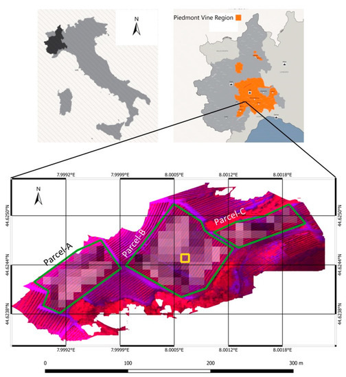 A vineyard located in Serralunga d’Alba (Piedmont, northwest of Italy), covering a surface of about 2.5 ha, was selected as a field test. The cropland, whose latitude and longitude positions range between and (World Geodetic System 1984-WGS84), includes three vineyard parcels (named “Parcel A”, “Parcel B” and “Parcel C”) cultivated with the cv Nebbiolo grapevine, with an area of around 0.36, 0.69 and 0.19 ha, respectively (Figure 1).