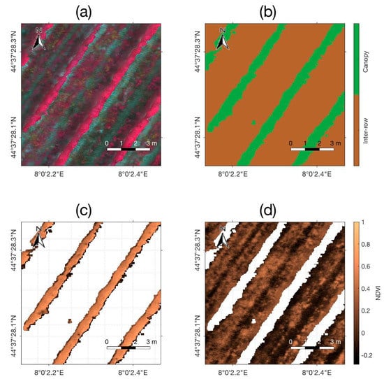 (a) Enlargement of subset of UAV map , highlighted by a yellow square in Figure 1, is represented in false colours (NIR, Red and Green channels); (b) classification of pixels into two classes: , representing vine canopies (green), and , representing inter-row surfaces (brown); (c) computed NDVI values of vine canopies pixels ; and (d) inter-row surface .