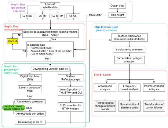 Due to seasonal variations in the ocean controlling factors (wave, tides, sea level rise, storms and sediment budget) and suitable atmospheric conditions, selection of satellite images at the same time of the year is important for studying the morphology of BIs [50]. Therefore, only those Landsat (MSS, TM, ETM+, and OLI) images were selected which had 0% cloud cover over the study area duly verified from the metadata file (.MTL) which is provided along each image. The objective for taking only those scenes with 0% cloud cover is due to the limitation of the optical imagery. This criterion can be relaxed to 10% to 20% provided the studied area (or the specific barrier island) is not affected. This limitation can be overcome by using the Synthetic Aperture Radar (SAR) imagery and authors do not exclude this possibility.