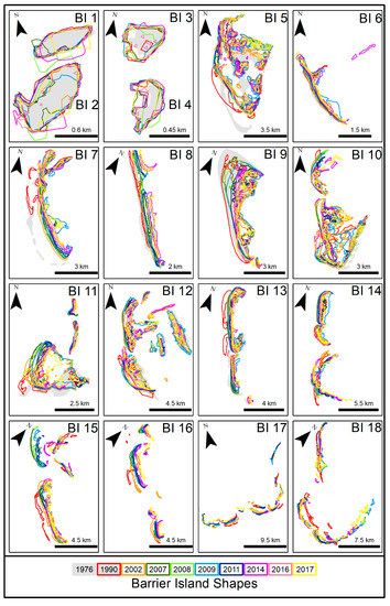 The variant changes observed in the boundary of BIs during study period indicate that generally, there is a retreat of the boundary, and shapes of the BIs have evolved (Figure 3). In Figure 3, the color variations represent the shape of a BI in a specific year. For BIs 1 to 13 the 1976 boundary (filled grey colored polygons) was used as a reference to gauge the movement of the BIs, while it should be noted that for BIs 14 to 18 there is no boundary for the year 1976 which was due to the unavailability of the L2 MSS image satisfying the image selection criteria (Figure 2), hence 1990 boundary (filled grey colored polygons with red outline) was used as a reference. It is evident that, except BIs 1 to 4, 6, and 13, the shape of the BIs has been evolving significantly which can be due to the climatic and oceanic factors. It has been observed that some of the BIs are shrinking while others are expanding in both directions—i.e., oceanside and landside—against the accelerated SLR.
