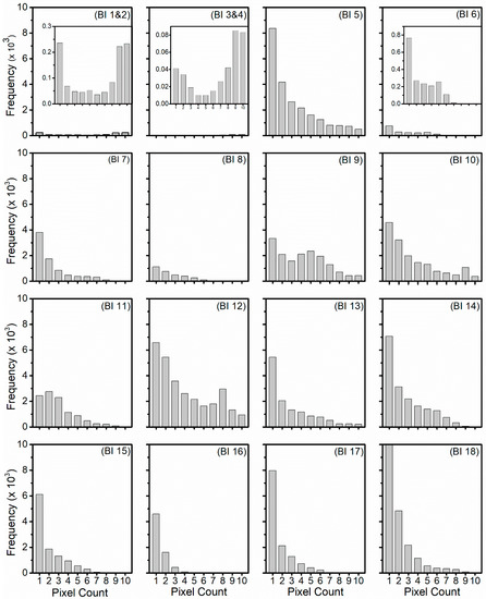Frequency pixel count of Barrier Island. The inset views for BI 1&2, BI 3&4, and BI 6 show the frequency of the data between 0 and 1 × 103.