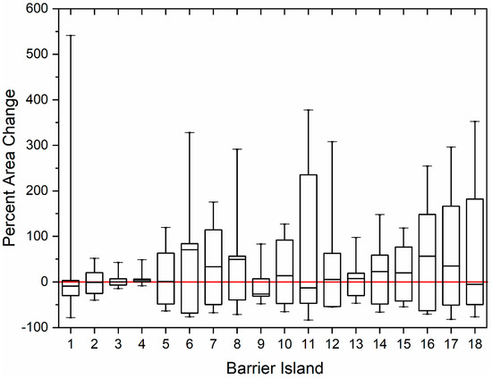 The box and whisker plot (Figure 5) show the percent change in area from 1976 to 2017 (for each BI) on the vertical axis, while the horizontal axis shows the BIs from 1 to 18. The red line shows the zero line of the data distribution. The value above the zero line shows the gain in area of a specific BI while the values below show the loss in area. It can be observed that Island 4 sustained, so we can say that the size of the box varies as there is variant change in area of the BI from 1976 to 2017. The Island 11 (Figure 5) shows the most vigorous change above the median value means the variance in data is higher in the 50th to 75th percentile of the data.
