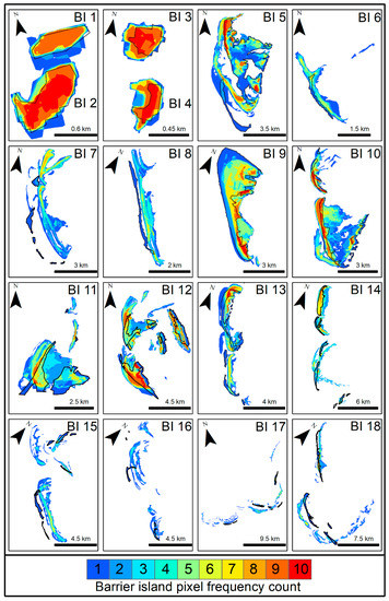 3.5. Pixel by Pixel Frequency of Barrier Island