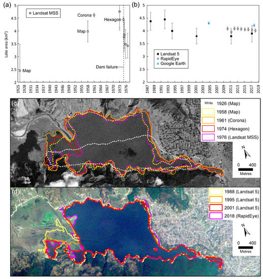 Changes in lake area before and after the most recent dam (1982). (a) Lake area change from 1926–1976 and (b) 1988–2018. (c) Lake shoreline change from 1926–1976 shown on a 1962 Corona satellite image, and (d) 1988–2018 shown on a RapidEye satellite image (April 2018). The 1926 and 1958 outlines are dashed due to georeferencing and geodetic uncertainty.