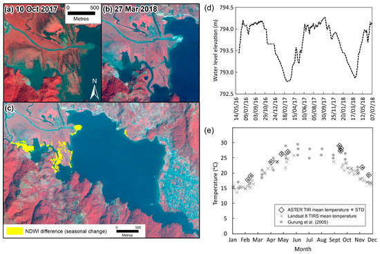 Seasonal changes at Phewa Lake. (a–c) Shoreline change between high (10 October 2017) and low (27 March 2018) water levels. Backgrounds are RapidEye false colour composites (bands: near-infrared, red, and blue). (d) Water level elevation recorded at Phewa Dam with a seven-day moving average. (e) Mean lake temperature derived from ASTER Thermal Infrared (n = 10, 2000–2018), Landsat 8 Thermal Infrared Sensor (n = 48, 2013–2018), and Gurung et al. (2005) (n = 30, 2000–2002).