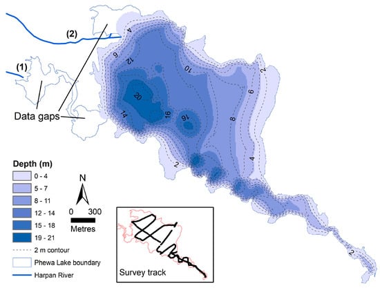 Lake bathymetry (18 May 2018). The Harpan River enters the lake at points (1) and (2).