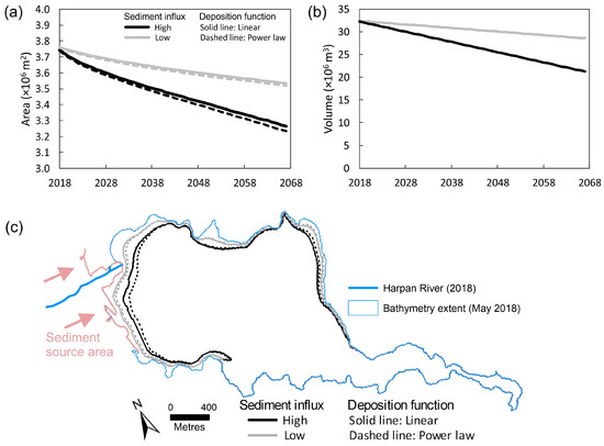 Modelled area (a) and volume (b) decrease for high and low sediment influx scenarios. (c) The resulting shoreline change to the year 2067.