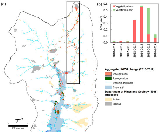 (a) Landslides and normalised difference vegetation index (NDVI) change in the Phewa Catchment. Inset box refers to Figure S3. (b) Areas of change in NDVI from 2010–2017.