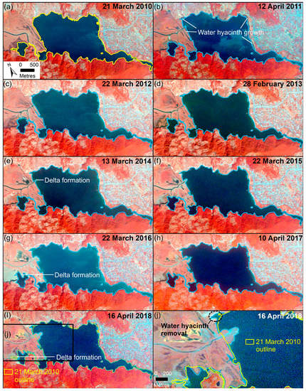 The slowdown in lake shrinkage in recent years could be associated with the removal of the invasive Water hyacinth (Eichhornia crassipes), which had colonised shallow areas of the lake shore [37]. This is apparent in the northeastern area of the lake (Figure 8j) where the plant was cleared before the establishment of a nearby paragliding landing site and cafes. The lake temperature (~15 °C–30 °C) (Figure 3e) provides close-to-optimum growth conditions for the plant [38]. The reduced lake area in 2011 compared to 2010 and 2012 was also linked to water hyacinth expansion on the shallow northeast and northwest shores (Figure 2b and Figure 8). The Supreme Court decision to construct check dams in the catchment will also contribute to reducing sediment influx to the lake [39] and could be used to initiate sediment monitoring of the Harpan River.