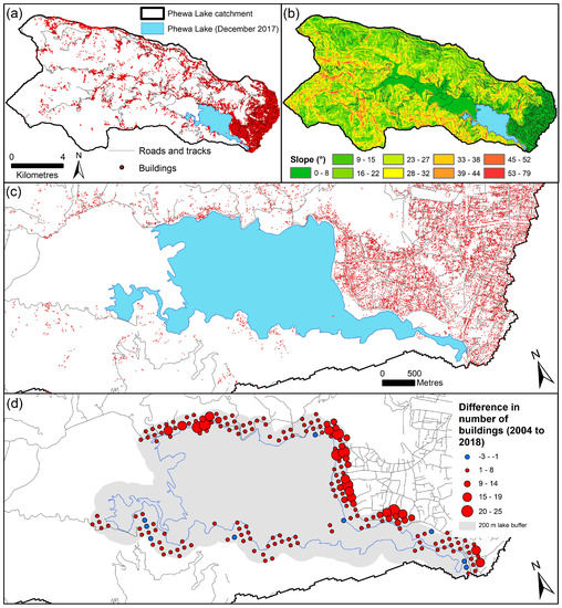 (a) Tracks, roads, and buildings in the Phewa Lake catchment. (b) Catchment slope derived from the Shuttle Radar Topography Mission DEM. (c) Enlarged view of the lakeshore. (d) Difference in the number of buildings within 200 m of the lakeshore, aggregated to a 1 km2 grid (2004–2018).