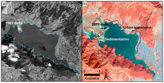 (a) Phewa Lake in 1961 with a panchromatic Corona satellite image background; (b) Phewa Lake in 2017 with a RapidEye image (10 November 2017) false colour composite background (bands: near-infrared, green, and blue).