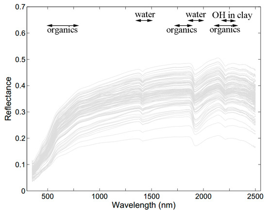 The spectral reflectance of soil samples (n = 106). The principal positions of spectral absorption by organics and water are highlighted.