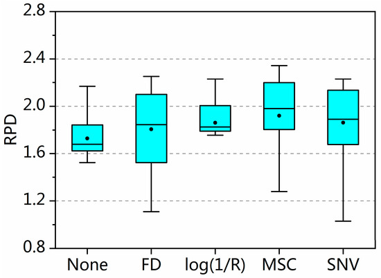 The boxplot of RPD value of the partial squares regression (PLSR) model after including pretreatment in sample selection is shown in Figure 5. Pretreatment improved sample selection in terms of mean, median, third quartile, and third quartile of RPD value. The analysis of variance (ANOVA) showed that log(1/R) and MSC significantly changed sample selection (p < 0.05) (Table 2). Thus, pretreatment’s influence on sample selection was significant and positive in most cases.