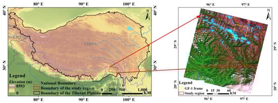 The study area located in the Parlung Zangbo basin and the Landsat-8 Operational Land Imager (OLI) image acquired on 6 October 2015 (a false color composite with a band combination, R = shortwave infrared band (band 7), G = near-infrared band (band 5), and B = green band (band 3)).