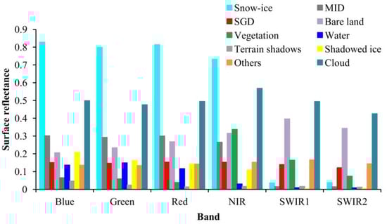 Based on the collected training samples, basic statistical parameters, such as mean, maximum, minimum, and standard deviation, were calculated for each input feature. The mean surface reflectance of various land cover samples (Figure 4) was analyzed to investigate the spectral characteristics of different land cover types. Such information will be used to separate different land cover types based on the differences in spectral reflectance. Snow-ice had high spectral reflectance in the visible spectrum (VIS) and very low reflectance in the shortwave infrared (SWIR) bands. Based on the strong differences in glacier spectral reflectance in the VIS and SWIR bands, snow-ice was identified by thresholding the NDSI feature. Figure S1 in the supporting materials for this article provides the examples of input data for the RF classification method for a subset of the study region. When analyzing the textural feature in more detail, it was noted that the mean feature (Figure S1i) was appropriate to describe the characteristics of the glacier surface. The general outline of glaciers can be recognized from the image of mean feature (Figure S1i). However, the glacier areas were not obviously recognized in the other textural features (Figure S1j–p).