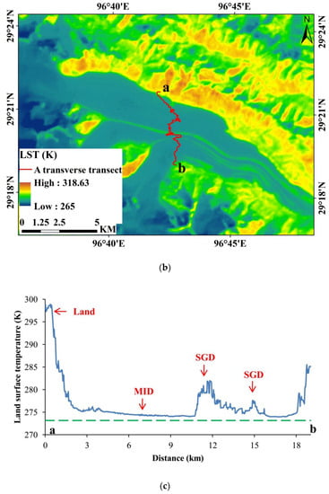 An example of the land surface temperature (LST) of different land cover types at the Yanong glacier of the Parlung Zangbo basin with one transect (from point a to point b) across the Yanong glacier and its surroundings (A transect in red): (a) A false color composite image with a band combination of 7/5/3 (R/G/B) of Landsat-8 OLI data on 6 October 2015; (b) a Landsat-8 LST image; and (c) statistics of land surface temperature across the transect (direction from NW to SE). The letters indicate MID = mixed ice and debris, SGD = supraglacial debris, and Land = bare land. The dashed line in green highlights LST = 273.15 K.