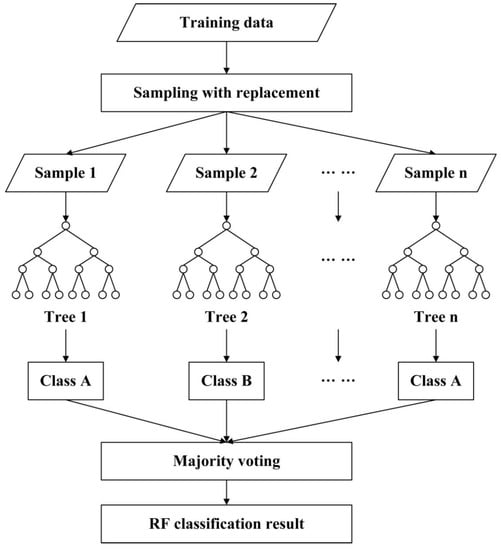 In the RF framework, the number of features applied in a classification is a user-defined parameter, but the RF algorithm is not sensitive to it []. The value is generally set to the square root of the number of all the input features []. Each decision tree in the forest is fully grown without pruning in order to insure low bias []. Finally, the forest chooses the most popular class as the final result (Figure 6).