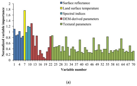 The normalized feature importance of all of the 70 input features in the RF classifier is shown in Figure 7. It should be noted that LST was the most important input feature in the classification, followed by elevation and NDWI. The top 4 most important features of the 12 topographic features were elevation, slope, shaded relief, and absolute elevation change. Besides this, the mean feature of each individual band was more important than other textural features (Figure 7b).
