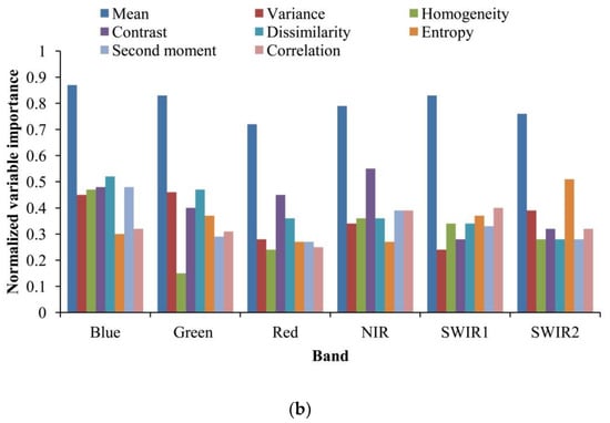 The textural features were mean, variance, homogeneity, contrast, dissimilarity, entropy, second moment, and correlation for each OLI spectral band (Blue, Green, Red, NIR, SWIR1, and SWIR2 band). They were computed using the values in the GLCM. The computational formulas of these features were defined by Haralick et al. [] (Table 5).