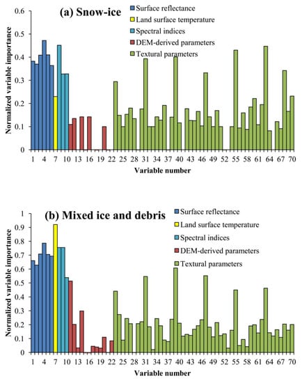 The RF classifier in image RF estimates the importance of a feature by computing the normalized and raw feature importance using OOB data. Specifically, the OOB samples for each tree are randomly permuted in the respective feature and used to run the tree to compute the accuracy []. The difference in values between the accuracy using two different samples is obtained by subtracting the accuracy of the permuted OOB samples from the accuracy of the non-permuted OOB samples. These difference values vary between each tree, and the average of the differences over all trees in the forest results in the raw feature importance of the respective feature. Normalized feature importance is calculated as the ratio of the raw feature importance over the respective standard deviation. Generally, the most important features for the entire RF are those with higher values of normalized feature importance. The normalized feature importance of all the 70 input features for the whole 10 land cover classes and for 4 individual classes (snow-ice, mixed ice and debris, supraglacial debris, and shadowed ice) was calculated for the image acquired on 6 October 2015. Among these 70 input features, the first 10 features are Landsat-8 OLI surface reflectance, TIRS land surface temperature, and three spectral indices (NDSI, NDVI, and NDWI). The middle 12 features are elevation, slope, aspect, and other DEM-derived features, whereas the last 48 are textural features (8 features for each OLI band).