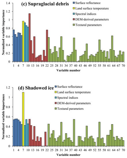 The normalized feature importance for four glacier classes, i.e., (a) snow-ice, (b) mixed ice and debris, (c) supraglacial debris, and (d) shadowed ice in the RF classification. (1–6: Landsat-8 OLI surface reflectance (Blue, Green, Red, NIR, SWIR1, and SWIR2 band); 7: land surface temperature; 8–10: NDSI, NDWI, and NDVI; 11–22: 12 DEM-derived features (elevation, slope, aspect, shaded relief, profile convexity, plan convexity, longitudinal convexity, cross-sectional convexity, minimum curvature, maximum curvature, root-mean-square error, and absolute elevation change); 23–70: eight textural features of each OLI band (average, variance, homogeneity, contrast, dissimilarity, entropy, second moment, and correlation).