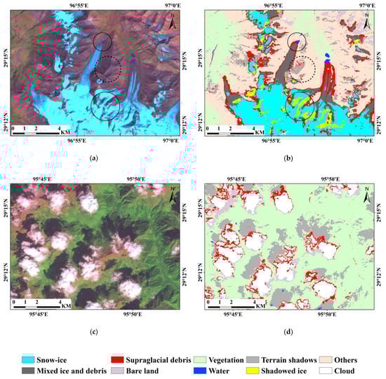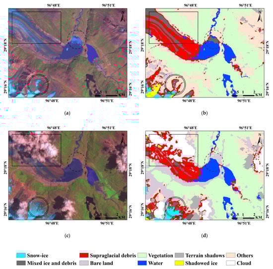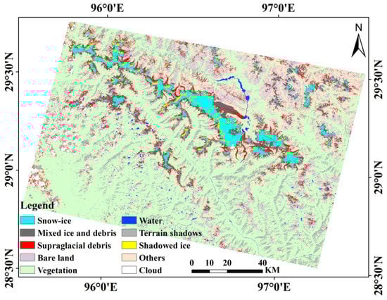 In this study, the image acquired on 6 October 2015 was used for training the RF classifier and other images were automatically classified using the same RF classifier. Then, relevant land cover classes were merged into a new class for each individual image. Specifically, snow-ice, ice mixed with debris, and shadowed ice were merged as a new class named non-or-partially debris-covered glacier. In this study, we assumed that the debris-covered glacier was fully covered by debris. So, supraglacial debris was recognized as one class. Cloud was also regarded as one class. The remaining non-glacial classes (including bare land, vegetation, water, terrain shadows, and other land cover types) were merged into one class. So, the resulting glacier map included four major classes: non-or-partially debris-covered glacier, fully debris-covered glacier, cloud, and unglaciated areas.