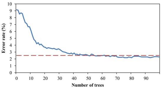 As previously stated, the RF algorithm draws about two-thirds of the original training dataset as a random sample, which is used to generate a decision tree without pruning. The remaining one-third of training samples are called out-of-bag (OOB) samples of each tree, which are later used to estimate the misclassification error (the OOB error) by cross-validating classification results []. As the forest is built, each tree can thus be tested on the OOB samples. This is the out-of-bag error estimate. It is an internal error estimate of a random forest while it is being constructed. The RF method estimates the importance of each feature in determining the classification results. This feature importance is estimated by permuting all of the observed values of a given feature in the OOB samples while all other features are left unchanged []. A greater increase in OOB error indicates greater importance of that feature.