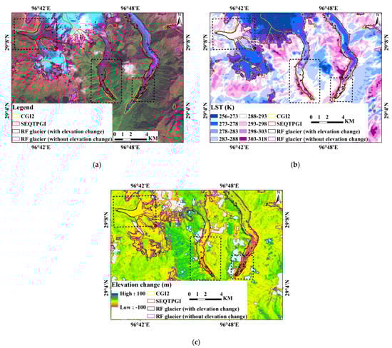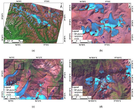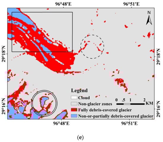 In summary, the aims of this step were to (1) minimize the effect of seasonal snow, especially for those often adjacent to the glacial edge; (2) remove misclassified frozen lakes, which were a problem of classification using only one image that was acquired in early October; and (3) remove and substitute the cloud-covered area by the pixels under clear sky conditions in the RF classifications of other scenes. Hence, the minimum glacier extent from multiple scenes was acquired after overlaying.