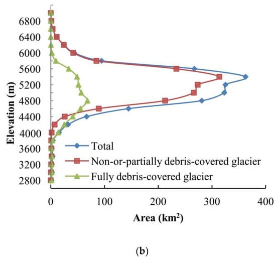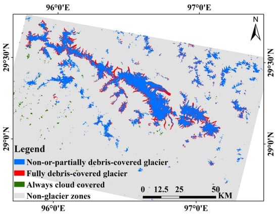 Most of the existing glacier inventories of many regions in the world were established based on remote sensing data, such as GLIMS (Global Land Ice Measurements from Space) [], HKH (Hindu Kush Himalayan) [,], GAMDAM (Glacier Area Mapping for Discharge from the Asian Mountains) [], MODICE (MODIS Persistent Ice) [], CGI1 (first Chinese Glacier Inventory), CGI2 (second Chinese Glacier Inventory) [], and the SEQTP (Southeastern Qinghai–Tibet Plateau) glacier inventory []. The majority of the available glacier inventories merely provide the total outline of glaciers. In other words, the boundary between debris-free and debris-covered glacier is not precisely distinguished. Different glacier facies have different melt rates and densities. Debris-covered glaciers play a significant role in the glacier mass balance because debris cover has a great influence on the melting rates of the ice underneath []. Specifically, thick debris cover can slow the ice melting rates owing to the low thermal conductivity of debris, while thin debris cover can enhance the ablation rates of underlying ice as a result of the low albedo of debris [,,]. Moreover, the occurrence of debris at the glacier surface is one of the most important factors driving albedo changes because it influences the features and evolution of glaciers []. It is necessary to estimate, therefore, the distribution of debris-covered glaciers to assess the effect of debris cover on ice ablation and to investigate the response of glaciers to climate forcing in terms of mass balance [].