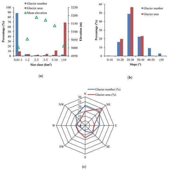 Finally, topographic parameters (mean elevation, mean slope, and mean aspect in degree) were calculated for each glacier using the zonal statistics tool and the raster calculator tool in ArcGIS 10.2. It should be noted that the mean aspect was not calculated by the average of all of the aspects of each glacier. Instead, the mean aspect was averaged by decomposing and averaging orthogonal components before transforming them back to the mean aspect, following a method presented in detail by Davis (2002) [].
