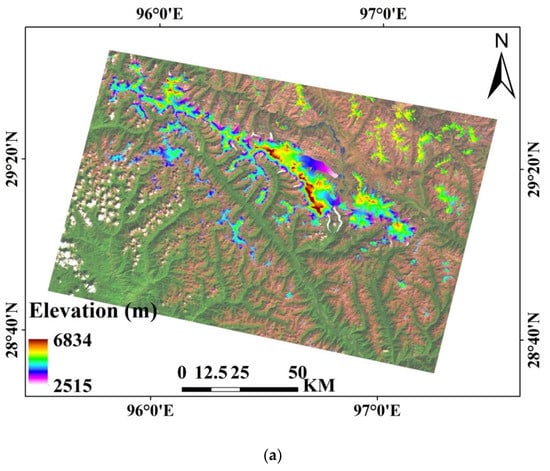 Glaciers in the Tibetan Plateau are sensitive and exhibit an immediate response to climate forcing; hence, they are important climate change indicators [,,]. It is, therefore, meaningful to observe and understand the dynamics and response of glaciers to changes in climatic conditions. Traditional methods of mapping glacier surface types are based on field surveys and analyzing topographic maps, which are very time-consuming and not feasible in inaccessible regions []. Nowadays, a vast amount of satellite data allows us to monitor the glaciers over large areas and in high altitude mountainous regions in a cheaper and efficient way. Remote sensing data usually can provide measurements of glacier coverage, glacier number, time span, and other glacier properties [].
