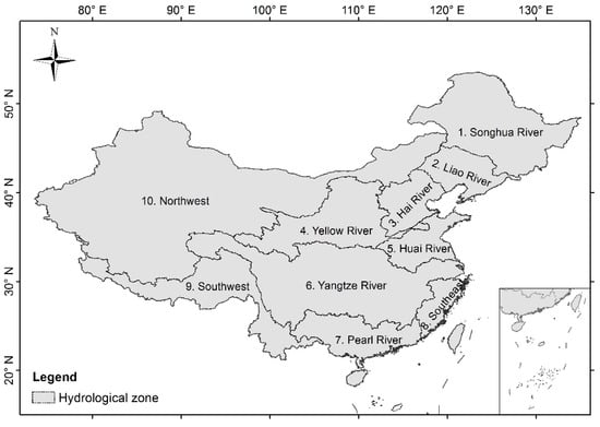 The 10 major hydrological zones of China denoted by a unique number: 1. Songhua River; 2. Liao River; 3. Hai River; 4. Yellow River; 5. Huai River; 6. Yangtze River; 7. Pearl River; 8. Southeast region; 9. Southwest region; and 10. Northwest region.