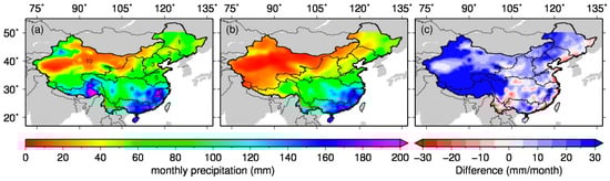 Monthly mean precipitation from (a) the raw satellite-based 3B42RTV7 data and (b) the gauge-based CN05.1 data, as well as (c) the difference between the two products over the overlapping period (2001–2016). (1–10) the basins/regions shown in Figure 1.