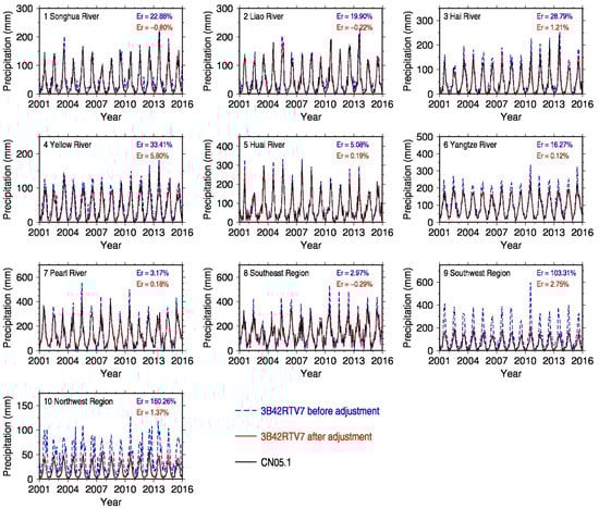 Comparisons of monthly precipitation from the 3B42RTV7 before adjustment (blue dash line), 3B42RTV7 after adjustment (rea line), and the gauge-based CN05.1 data (black line) during the overlapping period (2001–2016) for the 10 hydrological zones as shown in Figure 1.