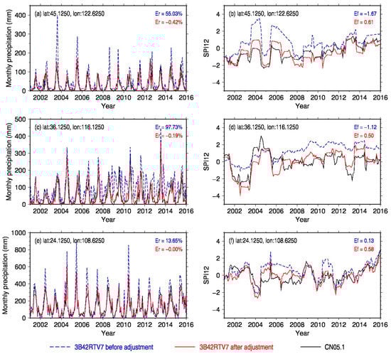 Figure 4 presents the monthly precipitation and the 12-month SPI (SPI12) derived from the satellite-gauge merged data before and after adjustment at three typical locations in North, Central and South China, respectively. Comparing with the observational CN05.1 data, the 3B42RTv7 shows an evident positive bias of 55%, 97%, and 13%, respectively, at each of the selected grid cells. As expected, the 12-month SPI estimated from the UN-SGMP fails to capture the inter-annual variability of SPI from the observational data (i.e., CN05.1), with the Nash–Sutcliffe efficiency (Ef) falling to the unsatisfactory catalog (less than zero). After the adjustment, the positive bias of monthly precipitation has been largely removed with the Er value around zero. The estimated 12-month SPI (using the SGMP data) have also well reproduced the observations, with the Ef no less than 0.50. This suggests that seamlessly merging the adjusted satellite RT data into the gauging data can benefit reliable estimation of SPI in near real-time mode.