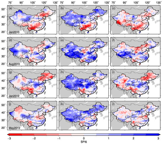 Six-month SPI (SPI6) derived from the OBS data (CN05.1; left panels), the UN-SGMP data (unadjusted 3B42RTV7–CN05.1 merged data; middle panels), and the SGMP data (adjusted 3B42RTV7–CN05.1 merged data; right panels) for January (a–c) and August 2010 (d–f) and for January (g–i) and May 2012 (j–l).