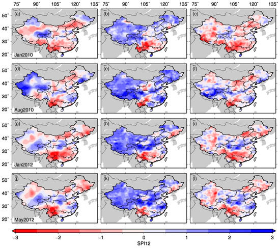 12-month SPI (SPI12) derived from the gauge-based N05.1 data (left panels), 3B42RTV7–CN05.1 merged data (middle panels), and adjusted 3B42RTV7–CN05.1 merged data (right panels) for January (a–c) and August 2010 (d–f) and for January (g–i), and May 2012 (j–l).