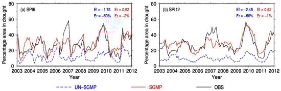 The 10-y percentage area in meteorological drought identified from the (a) 6-month SPI (SPI6) and (b) 12-month SPI (SPI12) based on the UN-SGMP (blue dash line), SGMP (red line), and OBS (black line) data.