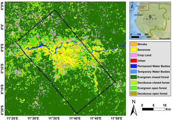 Study area, Gabon Lopé Park. The black polygon represents where UAVSAR acquired L-band TomoSAR data. The background is derived from the Africa Copernicus Land Cover of 100 m × 100 m spatial resolution [26]. The land cover shows different vegetation features of the Lopé National Park.