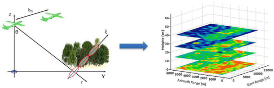 TomoSAR implementation requires accurate handling regarding the relative phase difference between different passes. The rationale of TomoSAR is to employ multiple flight tracks that are nearly parallel to each other [21], as shown in the left panel of Figure 2. The ensemble of all flight lines allows the formation of a 2D synthetic aperture, resulting from the coherent multiple single-look complex (SLC) images of different passes, providing the possibility of focusing the signal in the entire 3D space. By exploiting tomography, SAR data can be converted into a new multi-layer SAR data stack where each layer represents scattering contributions associated with a certain height, as shown in the right panel of Figure 2 [21]. We will refer to as the slant, azimuth, and cross ranges, respectively. We considered a data-set of SLC images acquired by N sensors in parallel track, and denotes the SLC value within pixel resolution cell in the n-th image. The expression of topography-compensated (tc) SLC data can be approximated [30] as: