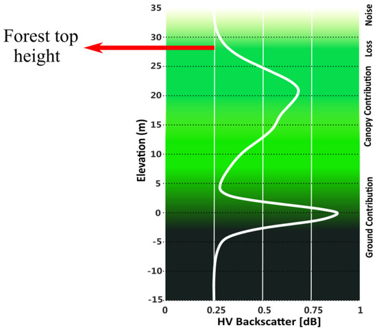 The canopy structure in tropical rain forests is more complex than any other forest type. The main challenge in such a field is the estimation of the forests’ top height because it is often difficult to clearly identify the top leaf or branch of a tree in the canopy. TomoSAR has been demonstrated as a powerful tool to estimate forests’ top height thanks to its accurate characterization of the vertical structure of tropical forests. Forests’ vertical structure can be observed by taking a tomographic profile, that is, a slice of the multi-layer data stack. Using the Capon beam forming power estimator, we can retrieve the 3-D backscatter distribution from the multi-layer SLC and show the vertical backscatter distribution function. Each vertical distribution is characterized by two effective contributions: one corresponding to the signal, where most of the backscatter is concentrated—the so-called Canopy contribution or phase center; and another contribution corresponding to the reflected signal from the ground. Figure 3 shows a schematic view of the vertical backscatter distribution in which it is assumed that the shape of the distribution can be divided into four zones. The first zone corresponds to the ground contribution, which is the signal reflected from the ground. The second one corresponds to the canopy layer contribution. The third one is the power loss zone, where the backscatter undergoes a loss along the vertical direction from the phase center (canopy contribution) location. Further away, the backscatter Capon profile is dominated by noise, unlikely to be associated with any physically relevant components. Forest top height can be retrieved by two different ways, either by identifying the power loss from the phase center location in the upper envelope of the profile or by identifying the power loss from the noise level (location of the highest return detected by the TomoSAR platform) to the forest’s top height.