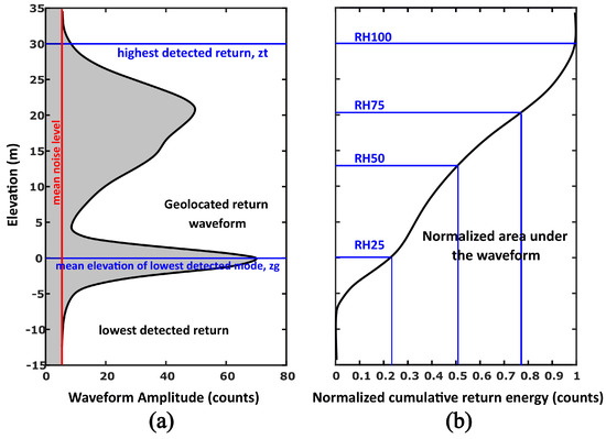(a) Schematic view of the Lidar LVIS waveform divided into four zones. Zone 1: ground contribution; Zone 2: Canopy contribution, Zone 3: Noise and unwanted reflected signal. (b) Extraction of Lidar Level 2 data from the LVIS waveform. RH100 is the elevation of the highest detected return (forest top height). RH25 is the elevation where 25% of the waveform energy occurs—it denotes the ground layer associated with LVIS data.