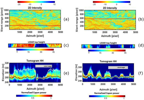 (a,b) The 2-D intensity of the TomoSAR image; the red lines correspond to the slant range positions where the cut was chosen. (c,d) The Lidar cut at two slant range positions 200 and 590, respectively. (e,f) HH Capon spectra. The black and white lines in (e,f) correspond to the digital terrain model (DTM) and canopy height model (CHM) from small-footprint Lidar (SFL), respectively. Capon power was normalized between 0 and 1 to enhance visualization of the scatterers.