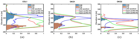 Regions of interest (ROIs) named (a) COL1, (b) OKO1, and (c) OKO2 in Gabon Lopé Park. HH (in red) and HV (in green) Capon profiles. Capon power and LVIS waveform power were normalized between 0 and 1. The histograms of SFL canopy and ground elevations are presented respectively in blue and brown. The blue curve corresponds to LVIS waveform Level 1B.