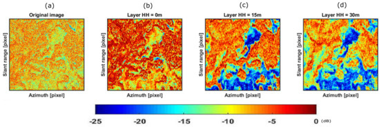 (a) Original SAR image. HH power intensities associated with a SAR image with three layers produced by TomoSAR: (b) 0 m, (c) 15 m, (d) 30 m.
