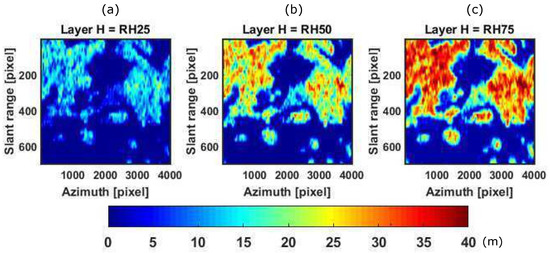 Lidar LVIS Level 2 different layers: (a) RH25, (b) RH50, and (c) RH75 corresponds to the Lidar LVIS layers. RH25% represents the elevation where 25% of the waveform energy occurs (ground layer). RH50% represents the elevation where 50% of waveform energy occurs, and RH75% represents the elevation where 75% of waveform energy occurs.