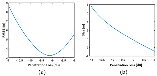 (a) Forest top height root mean square error (RMSE) and (b) bias versus penetration loss with respect to noise floor elevation.