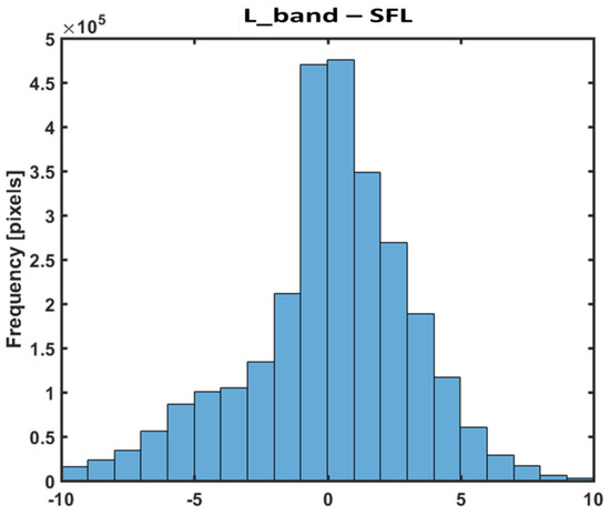 Finally, canopy height estimation using L-band TomoSAR data can be performed efficiently even in tropical forests. By evaluating the vertical forest structure from tomographic profiles, forests’ top height can be retrieved. Using the CHM from SFL data as a reference, the power loss value of −1.8 dB (from −11 dB to −9.2 dB, a 1.8 dB difference) with respect to the noise floor location (in the vertical profile distribution, upper zone) was used to retrieve forest height with no bias and minimum errors. Note that the same power loss value cannot straightforwardly be transferred to other campaigns’ study cases. As shown in the frame of the BioSAR 2008 campaign [33], the power loss should be varied in space due to a strong variation of the vertical resolution across the scene swath. Here, the RMSE was estimated to be 3.32 m, as shown in Figure 9. This shows that there is no limitation to the implementation of a canopy height retrieval algorithm with L-band TomoSAR. Recent studies reported an RMSE of 2.5 m using P-band TomoSAR in tropical forests [22]. P-band penetration performance is better than L-band due to its longer wavelength, which allows fewer interactions with leaves and branches, leading to a deeper penetration to the ground layer. To give precise knowledge about the accuracy of our proposed method applied in estimating forest top height, in Figure 10c we show the spatial distribution of the height differences between L-band TomoSAR and Lidar height. After analyzing the histogram of Figure 11, it is noticed that the histogram of the height difference between TomoSAR and Lidar tended to be normally distributed. We can generalize that the height difference values between TomoSAR and Lidar were distributed around −0.059 m, having an RMSE of 3.32 m. Our results considerably reinforce the proposal that L-band TomoSAR will be able to provide highly a accurate 3-D vertical structure, even in highly dense forests worldwide.